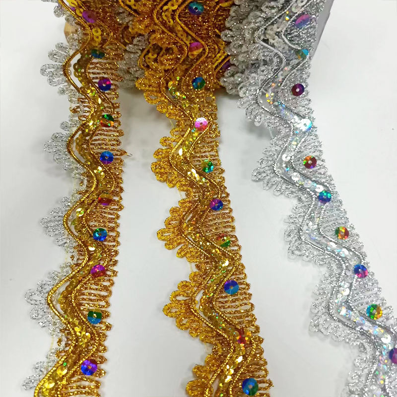 Аксесуари для одягу Золота та срібна металева межа з мереживом для обробки мережива Мулькольорова блискітка золота нитка металева мережива, прикрашена золотими та срібними двоколірними металевими проводами та семиколірними блискітками, це створює чудовий і сліпучий ефект окантування. Він підходить для прикраси манжет, комірів та подолів високого класу одягу, таких як вечірні сукні, сценічні костюми та весільні сукні. Матеріал легкий і гнучкий, не в’яне і таблетки, а також підтримує власну ширину та візерунки, додаючи одягу розкішний блиск.